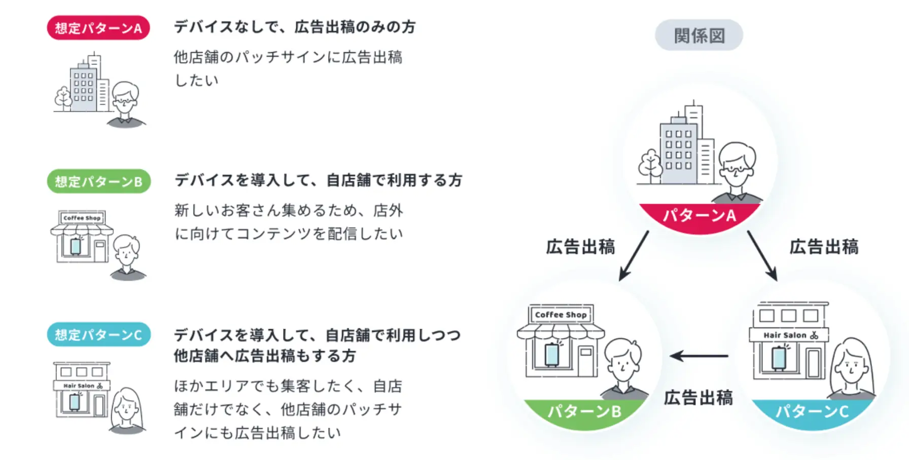 パッチサインでは、出稿する広告コンテンツの出稿範囲を自由に決めることができ、また相互配信ができるため、幅広い場所でコンテンツを配信できるのが魅力の一つです。